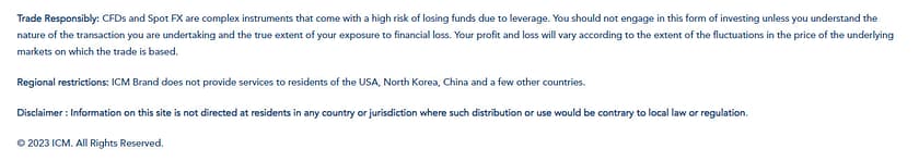 Dalam kasus ICM Capital, Anda dapat menemukan negara-negara yang dibatasi, termasuk AS, Korea Utara, dan China. ICM juga menyatakan bahwa mereka tidak menerima klien dari beberapa negara lain, dan mengunjungi situs web Inggris dan mencari informasi tambahan tentang hal ini tidak memberikan informasi lebih lanjut tentang masalah tersebut.