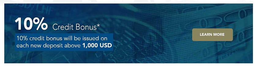 Mereka saat ini menawarkan bonus kredit 10% yang akan berlaku untuk semua akun dan akan diberikan pada setiap deposit baru di atas 1.000 USD. Perhatikan bahwa bonus ini berbeda dengan bonus pendaftaran, di mana broker hanya akan mendanai kredit Anda dengan bonus di akun baru dan hanya sekali.