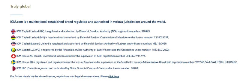 - ICM LLC (Qatar) diregulasi oleh the Qatar Financial Centre of Qatar dengan nomor lisensi: 00908.