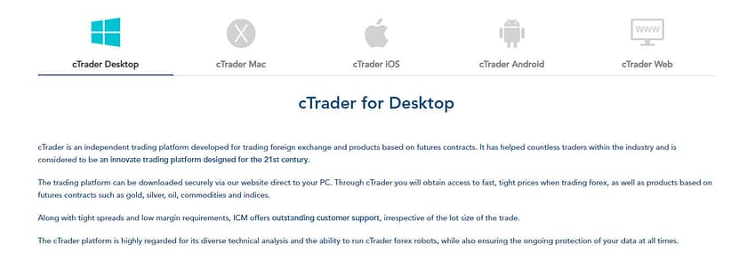 Kemudian cara terakhir ICM Capital memungkinkan klien trading forex dan produk lainnya berdasarkan kontrak berjangka adalah melalui platform cTrader. ICM mengklaim bahwa ia telah membantu banyak sekali trader di sektor keuangan, dan platform tersebut mungkin merupakan salah satu platform trading inovatif terbaik yang dirancang untuk abad ke-21. Platform ini tersedia untuk sebagian besar perangkat yang meliputi;