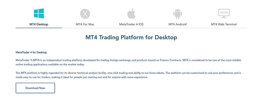 Gambar di bawah menunjukkan screenshot dari halaman MT4 mereka, tetapi halaman MT5 mereka identik, menyediakan fitur yang sama dan perangkat yang tersedia.