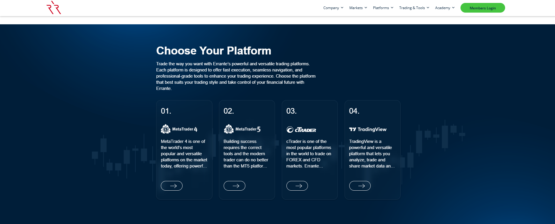Errante claims it was founded around 2019, although some sources reference 2018 as its origin date. Its operations are headquartered in Seychelles for the main entity; the European arm is linked to Cyprus. The group structure also references Circumvenio Holdings Ltd (registered in Cyprus) as an operating or content provision entity. One of Errante’s key selling points is its support for multiple top-tier trading platforms. Clients are offered MT4, MT5, cTrader, and integration with TradingView for charting and order routing. The presence of cTrader and TradingView distinguishes Errante somewhat from brokers that rely exclusively on MT4/MT5. +1 Errante also supports copy trading, MAM/PAMM accounts, and claims to provide VPS hosting to support fast execution and automation.Their product catalog is marketed as more than 100 instruments across multiple asset types.