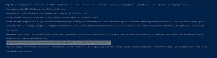 To determine the regions in which Loyal Primus is able to operate, you can refer to the footer section of their website. While the information provided is limited, it states that Loyal Primus Ltd. does not provide services to residents of Afghanistan, Cuba, Iran, North Korea, Sudan, Syria, Ukraine, and the USA.