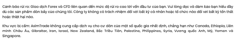 AximTrade cũng giúp bạn dễ dàng tìm thấy các quốc gia mà họ không thể cung cấp dịch vụ. Thông tin này cũng có thể được tìm thấy trong phần chân trang của trang web của họ dưới thông tin quy định.
