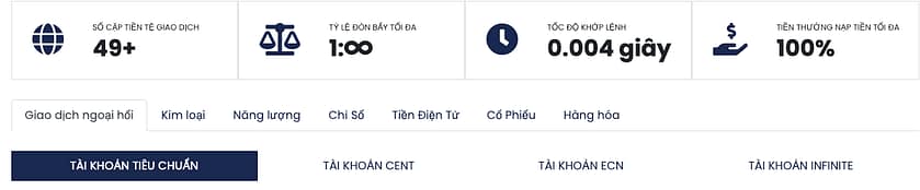 Họ nêu rõ: “Các nhà giao dịch có thể chọn giữa các loại tài khoản khác nhau dựa trên chiến lược giao dịch, kinh nghiệm và vốn được thiết kế để đầu tư của họ. Các lựa chọn bao gồm tài khoản giao dịch Tiêu chuẩn, Cent hoặc ECN. Tất cả các tài khoản đều cung cấp cơ chế bảo vệ số dư âm với mức chênh lệch thấp từ 0 đến 1 pip trên tất cả các cặp tiền chính”.